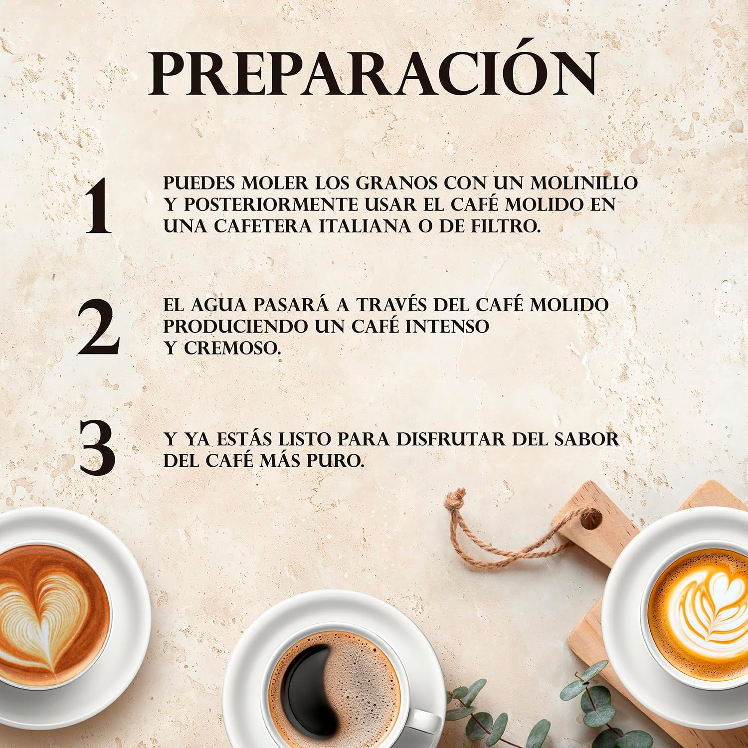 El sabor es intenso pero no excesivo, ideal para preparar espresso, filtrado o cappuccino.